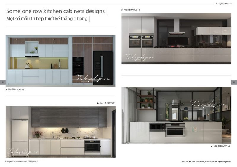 Trên đây là một số mẫu thiết kế phòng bếp được trang trí hệ thống tủ gỗ công nghiệp hiện đại 1 hàng tiện lợi và trẻ trung
