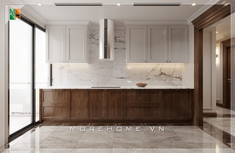 Kiểu dáng thiết kế nội thất bếp hiện đại cùng với sự hài hòa của màu sắc đã tạo nên một không gian ấn tượng. Phòng ăn cũng được trang trí với những tủ bếp hiện đại, bàn ghế và tranh canvas treo tường để tạo nên sự sáng tạo và hấp dẫn.