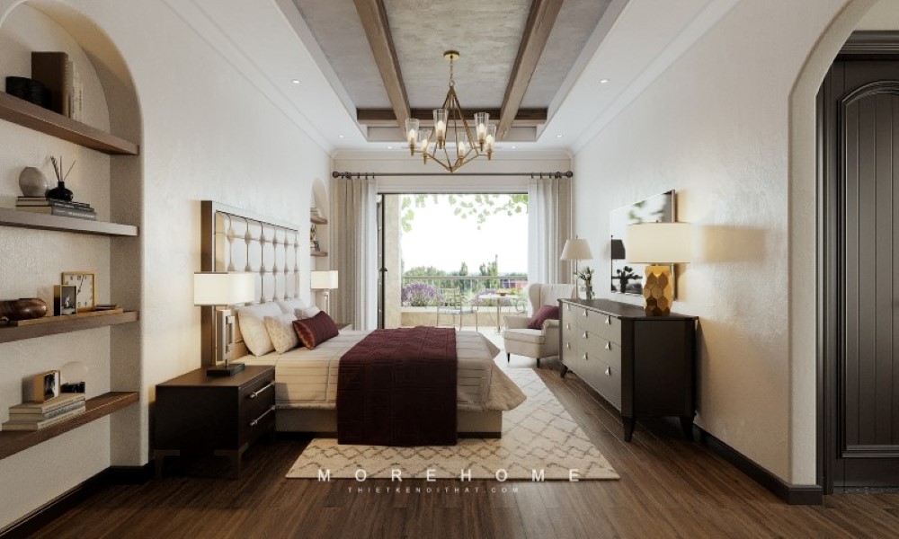 Morehome đã thực hiện hình ảnh công trình thi công giường ngủ gỗ tự nhiên tân cổ điển với phun sơn màu trắng đẹp.
